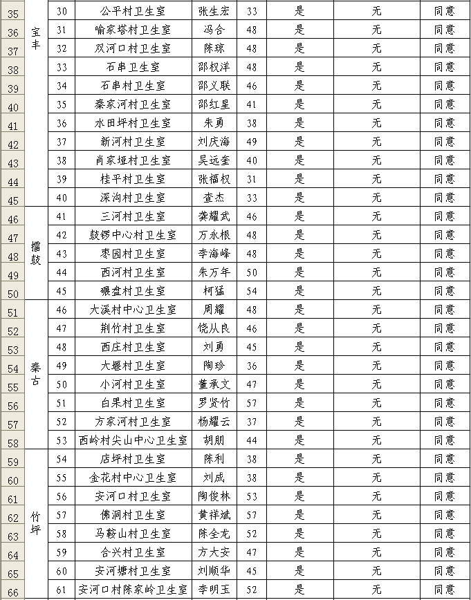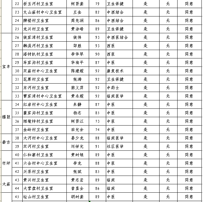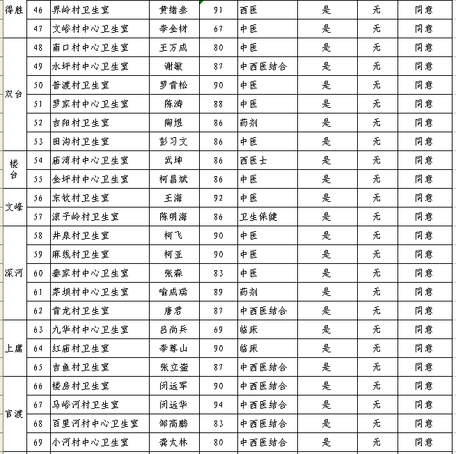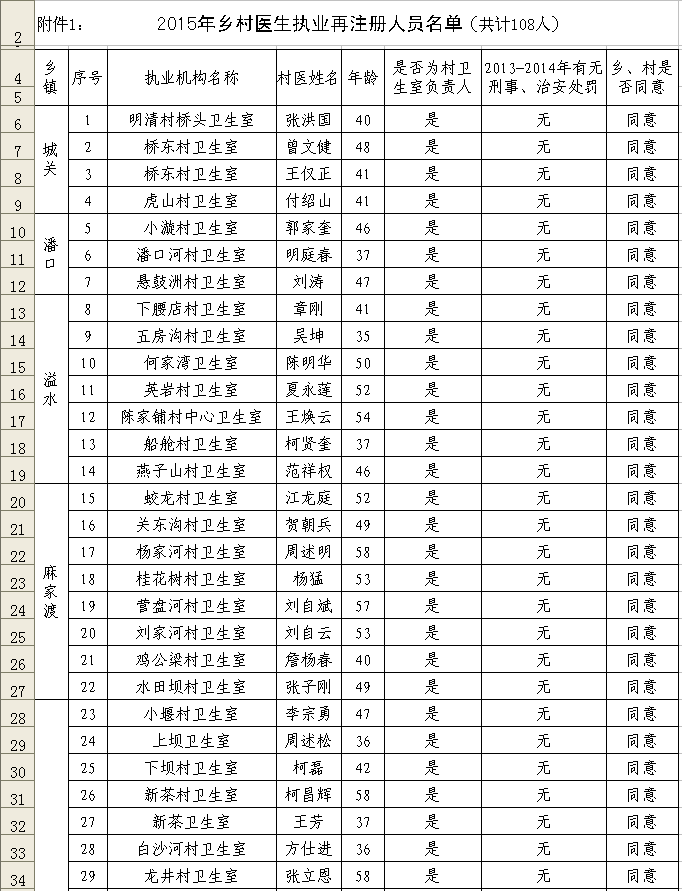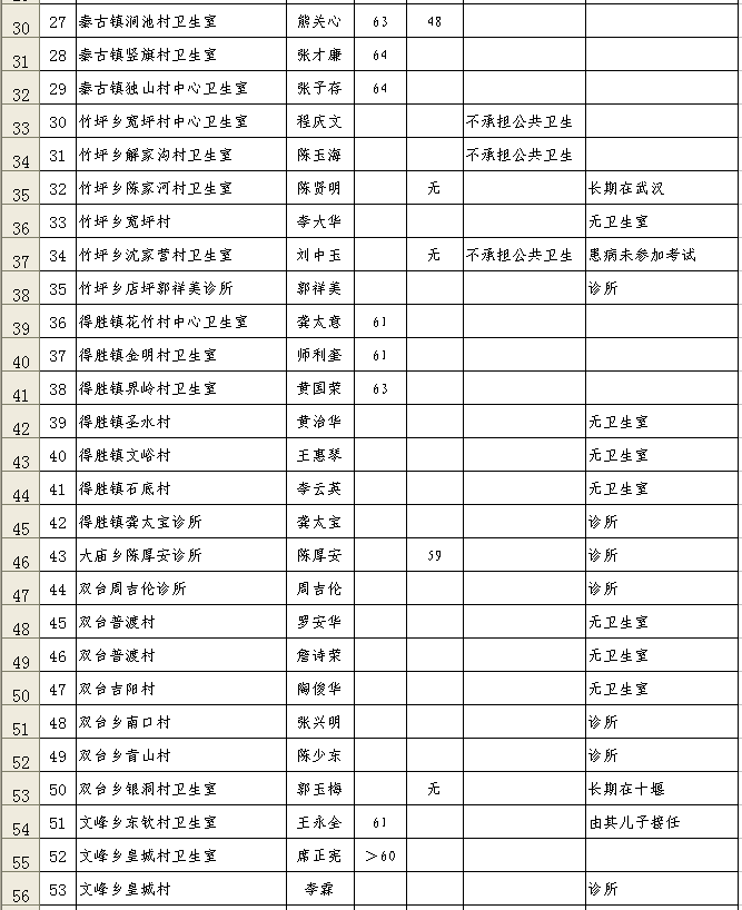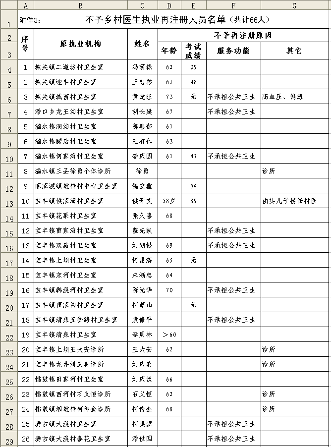 為依法規范鄉村醫生執業活動,切實加強鄉村醫生隊伍管理,依據《鄉村醫生從業管理條例》、《湖北省鄉村醫生執業注冊管理實施辦法》、原衛生部關于印發《診所基本標準》的通知(衛醫政發[2010]75號)等規定,縣衛生計生局已完成了對全縣鄉村醫生執業注冊培訓、考試和考核,現將結果公告如下: