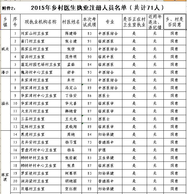 2、人數:本次參加執業注冊學習培訓、考核111人,1 人不及格,本次擬同意執業注冊71人(名單見附件2)。