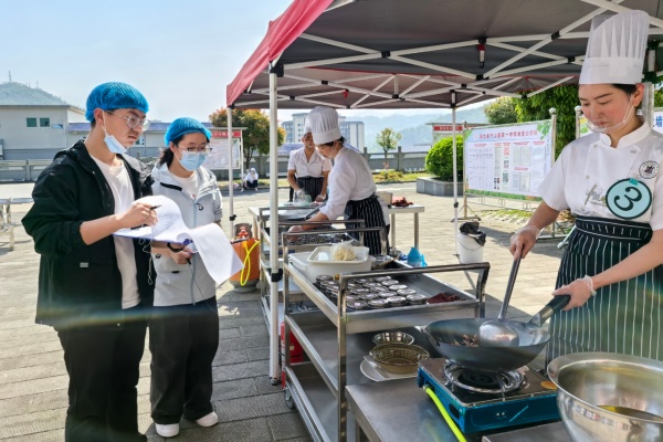 比賽現場,廚師們著裝規范,食材清洗干凈、分類擺放,葷素刀具和砧板嚴格分開。食品安全組全程巡查監督。大賽從營養安全性、廚藝技能、受眾滿意度三個維度考評,設置面條類和菜肴類兩大項目,既考驗基本功,又鼓勵創新。由校外技師、校領導、教師代表、家長代表和學生代表組成評委組打分,其中3名學生代表參與評審,體現“以學生為中心”的服務理念。