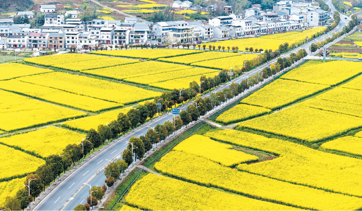 3月30日,記者駕車(chē)穿行于G346國(guó)道竹山縣麻家渡段,映入眼簾的是一幅流動(dòng)的生態(tài)畫(huà)卷:生態(tài)公路蜿蜒穿越連綿的金色油菜花海;路旁行道樹(shù)新綠吐翠,與錯(cuò)落有致的民居、金浪翻涌的花田相映成畫(huà)。 (劉 昆 攝)